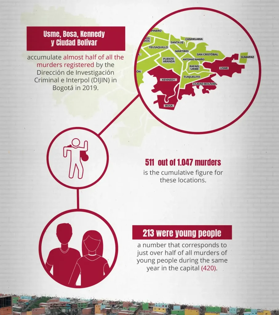 Usme, Bosa, Kennedy and Ciudad Bolívar accumulate almost half of all the murders registered in Bogotá in 2019 (511 of 1047 murders), by the Directorate of Criminal Investigation and Interpol (DIJIN), and a few over half of all murders of young people during the same year in the capital city (213 of 420 young people murdered).